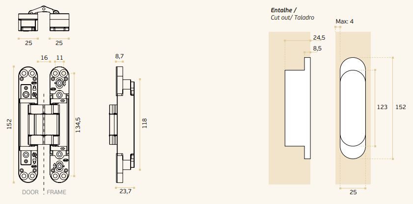 The hinge allows three-dimensional adjustment. The door can be aligned in three axes making possible the perfect alignment of the door with the wall where there is frameless architecture.