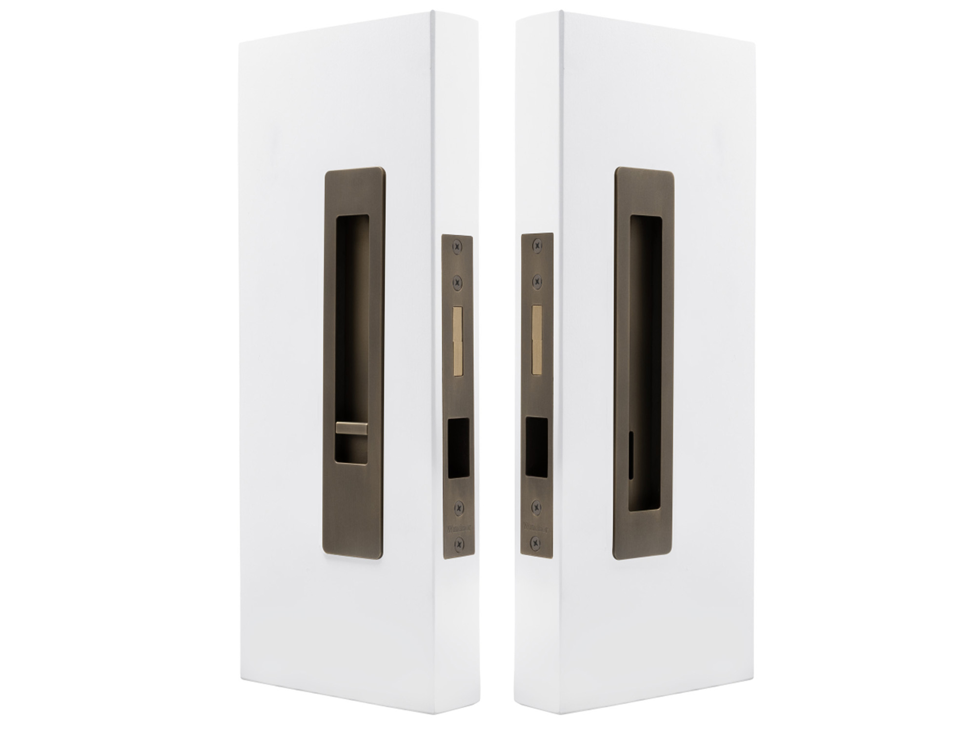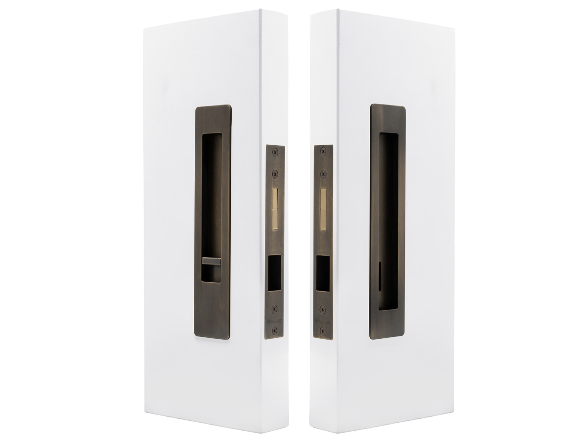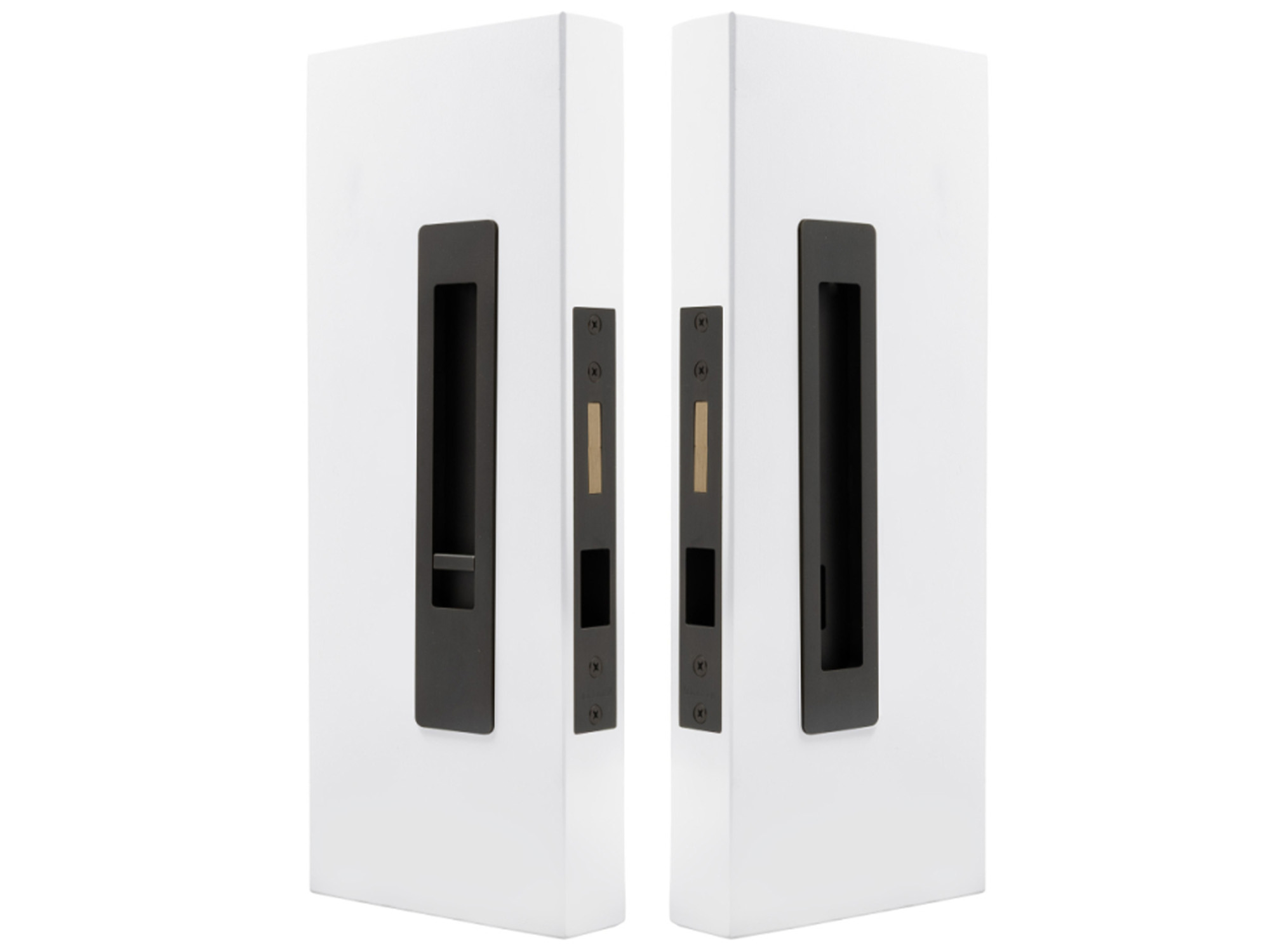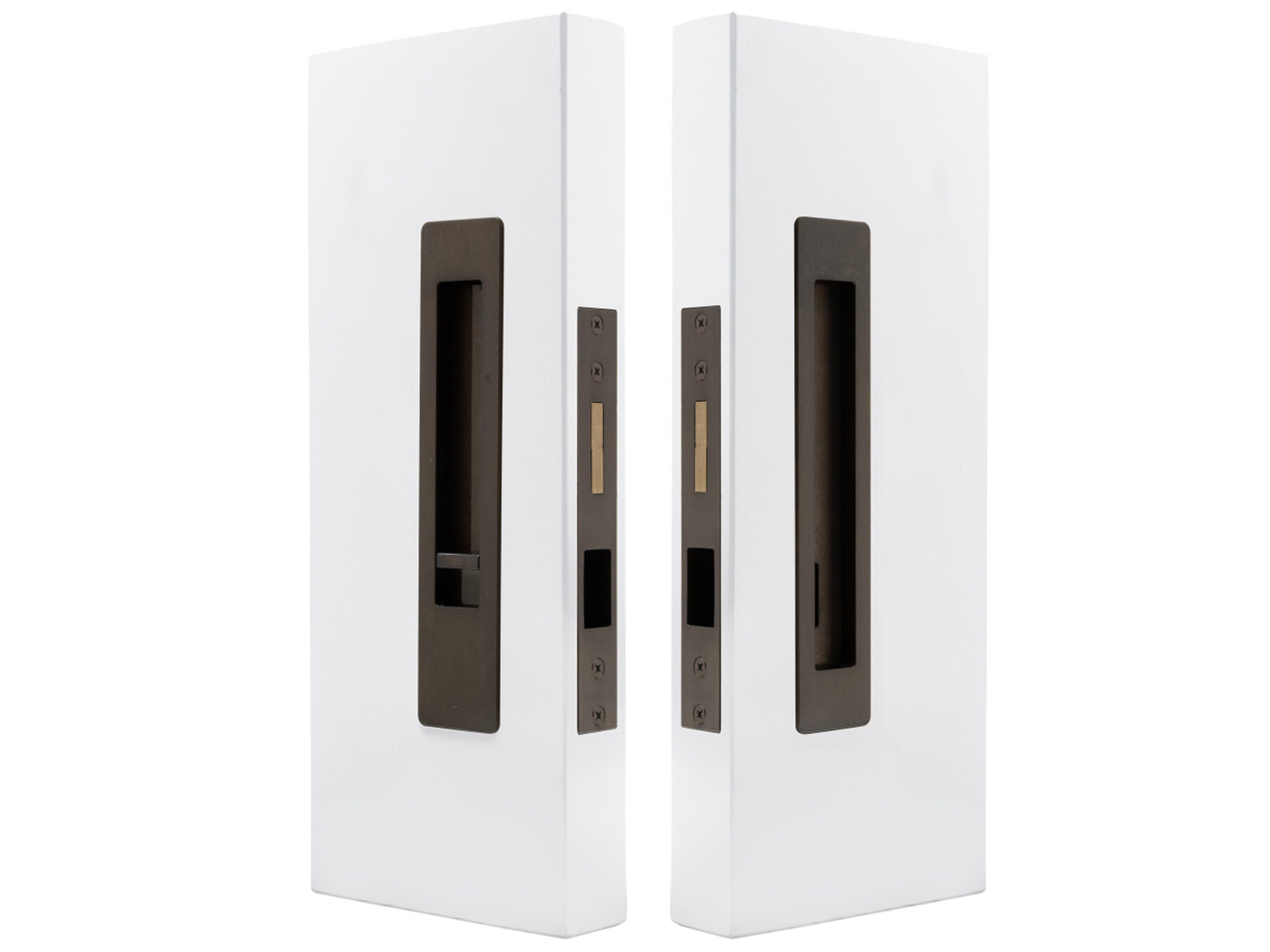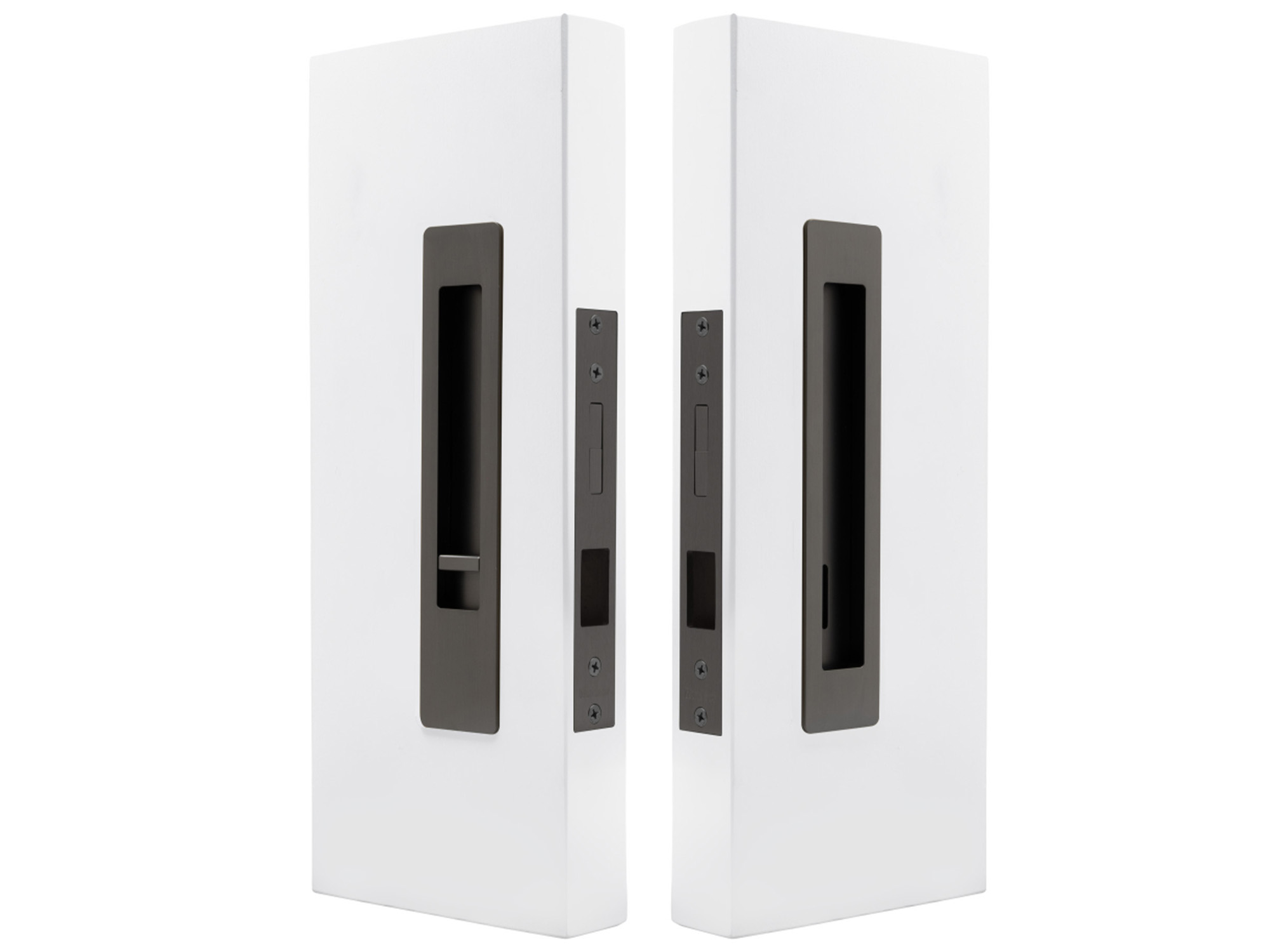 This architectural sliding door privacy set offers the ability to lock with the snib on the inside, and if needed unlocked from the outside with the emergency release.