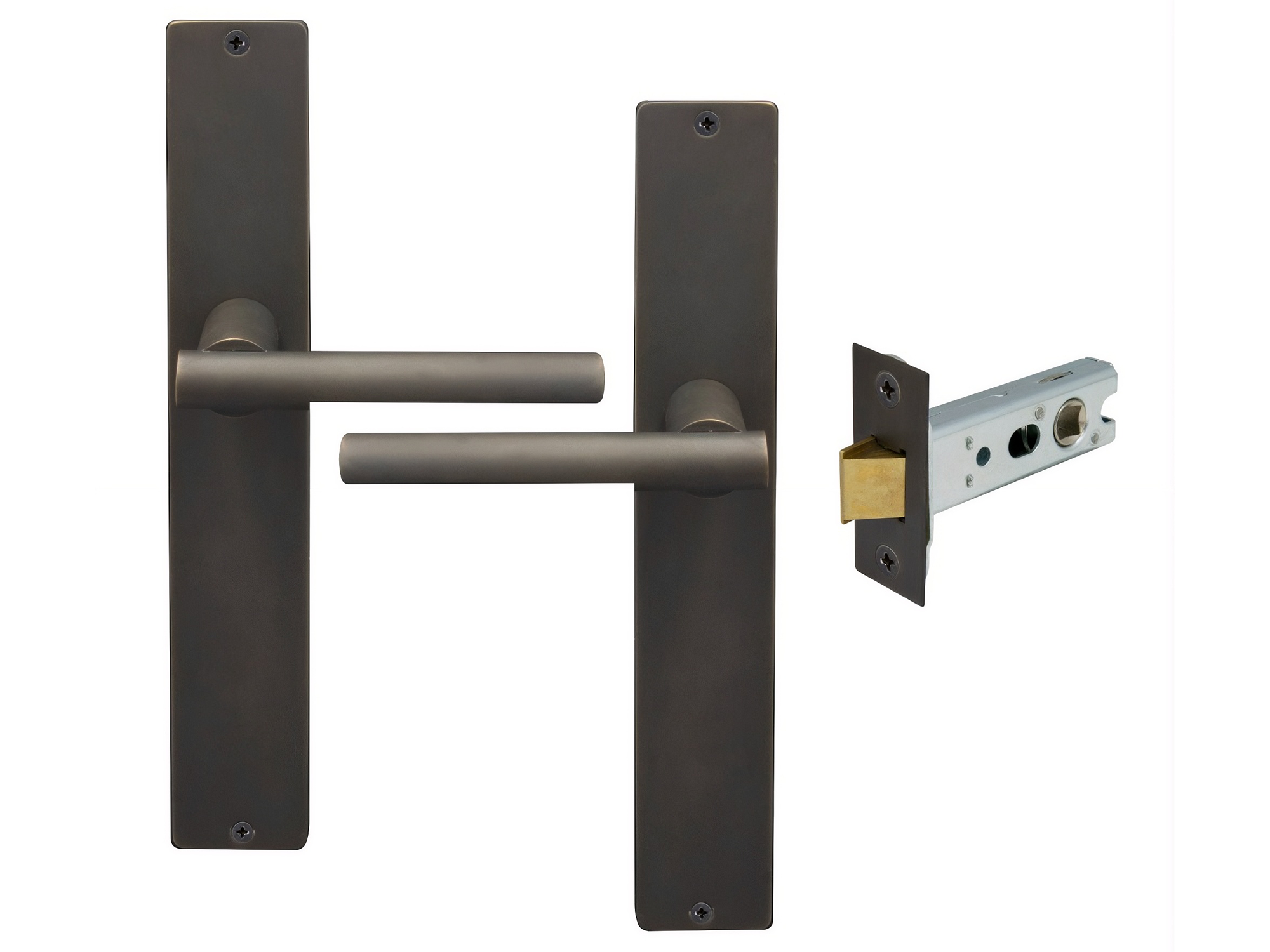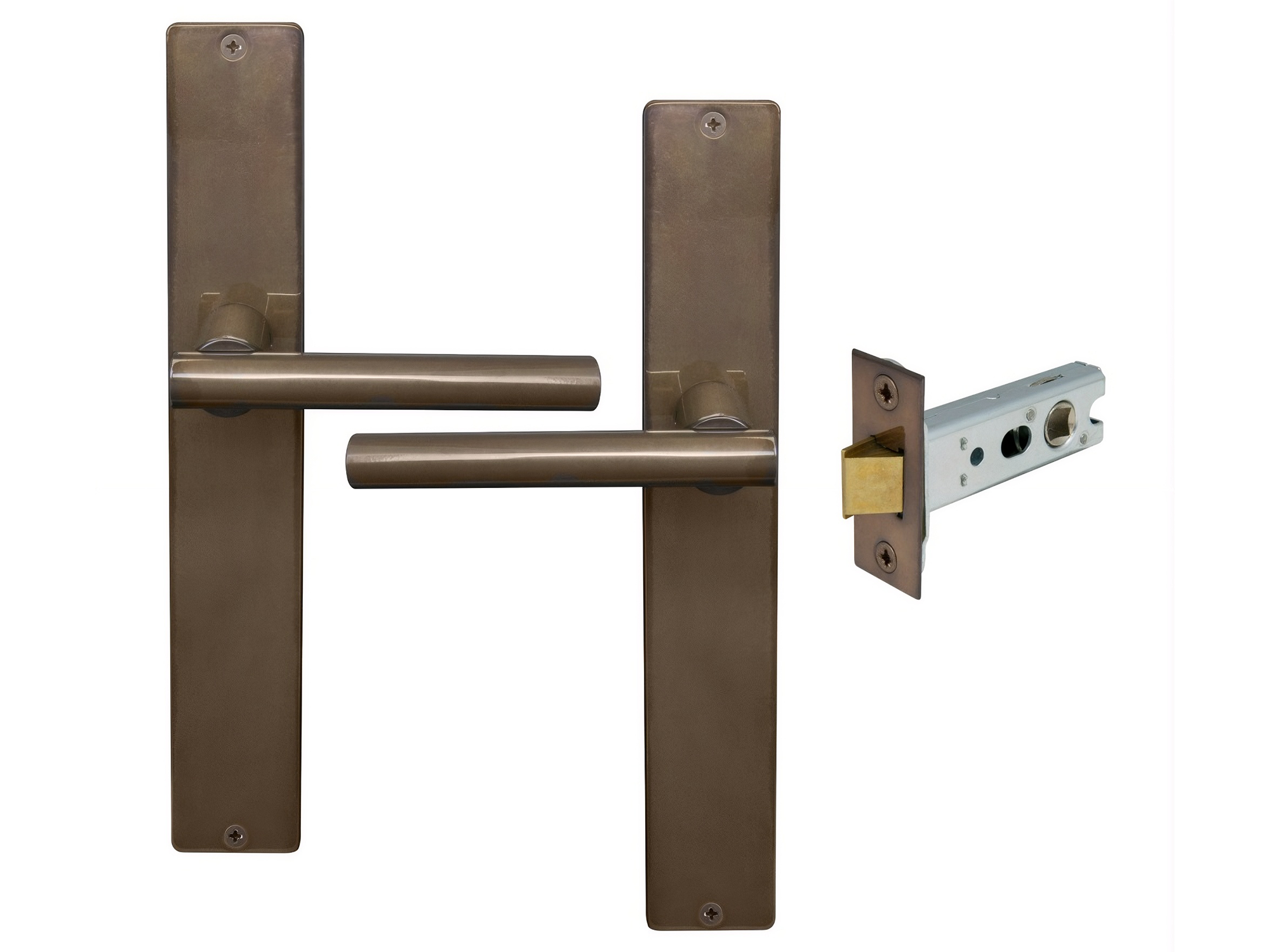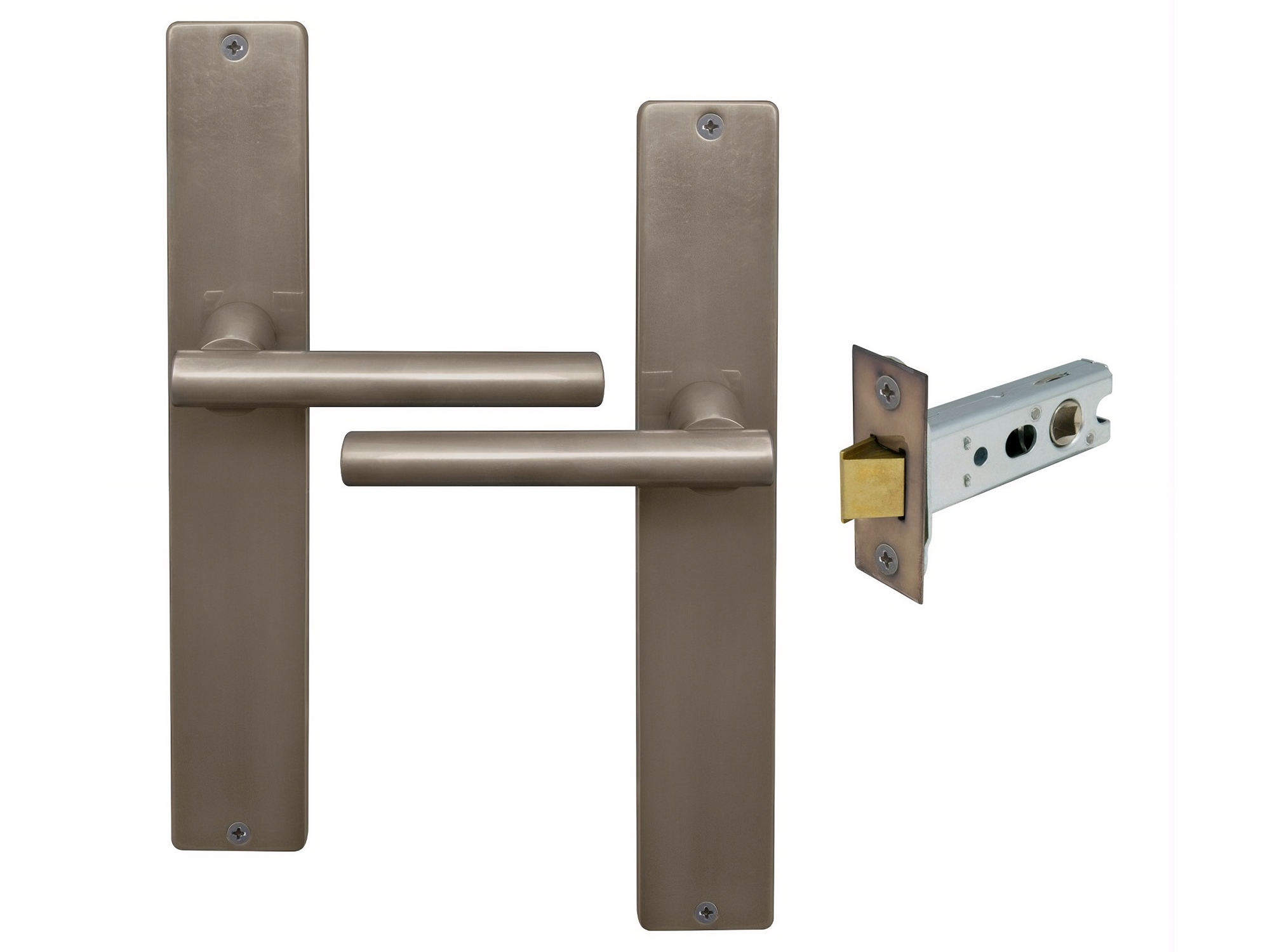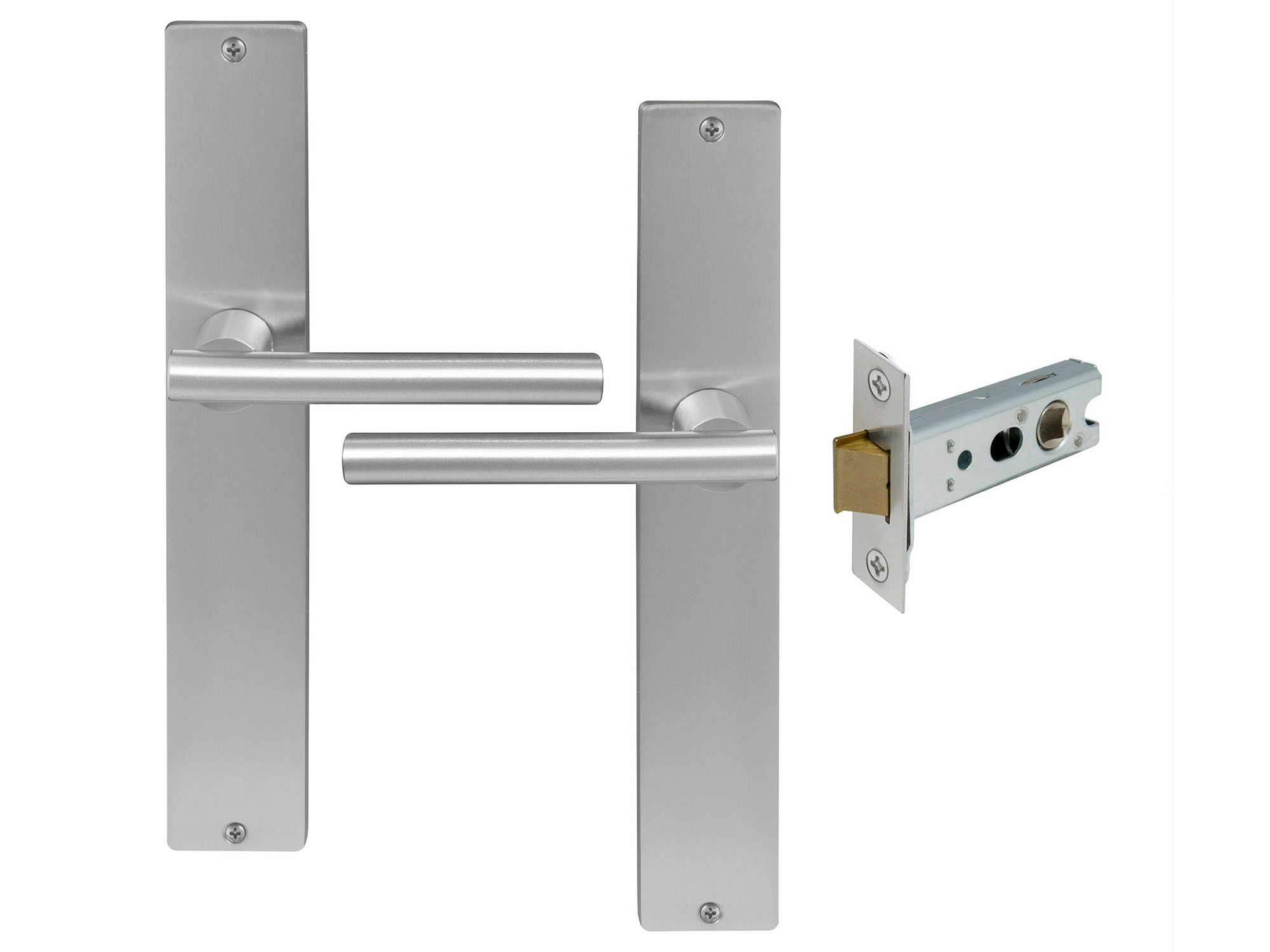 Kit includes a pair of handles with 1172 Heavy-duty 57mm backset tubular latch and fixing screws.