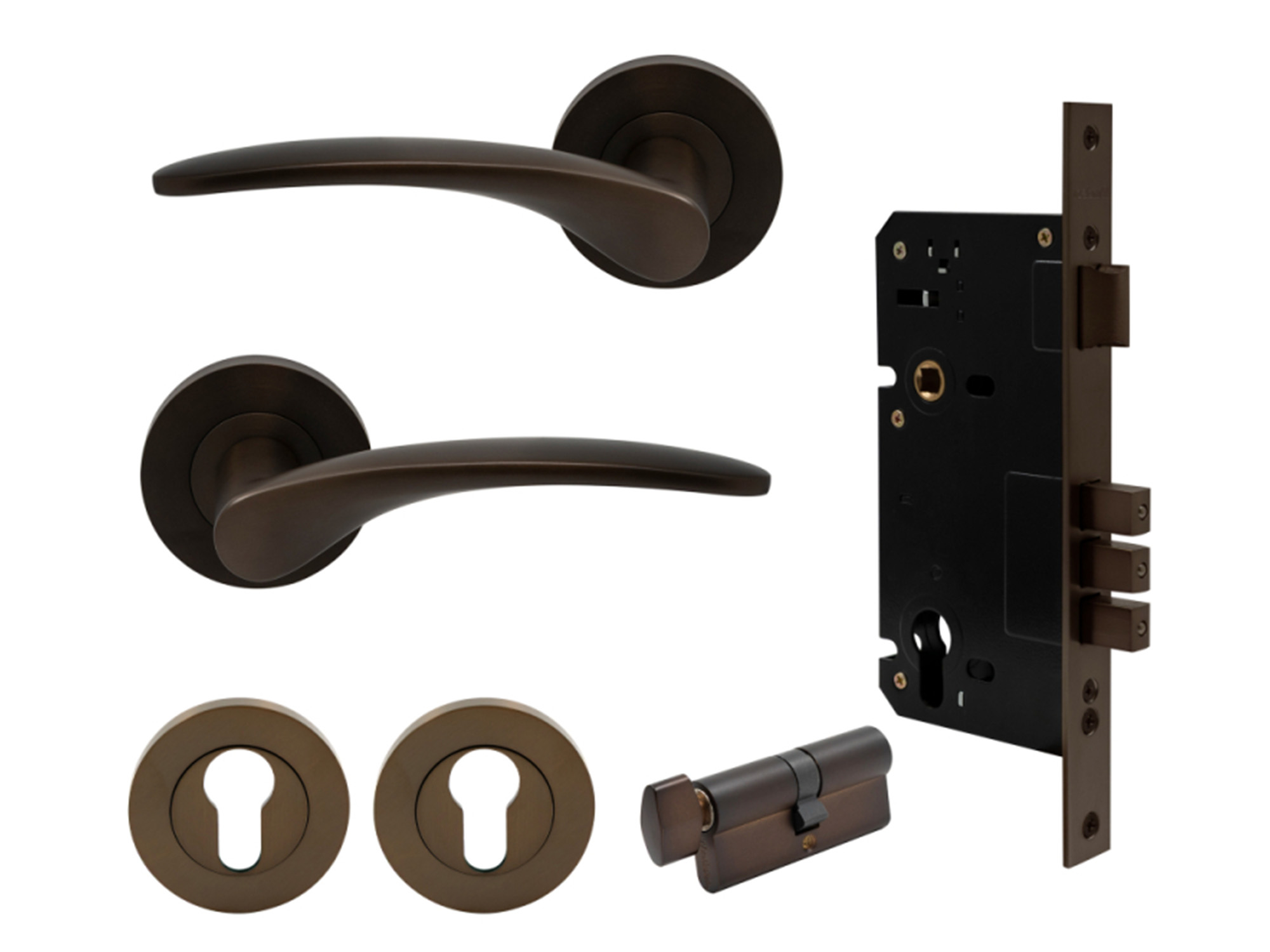 Pricing is for 1 pair of levers, 1 x 1143 60mm backset euro lock body, 1 x 1148 70mm euro cylinder with turn snib, and 1 x pair of 8081 euro escutcheons.