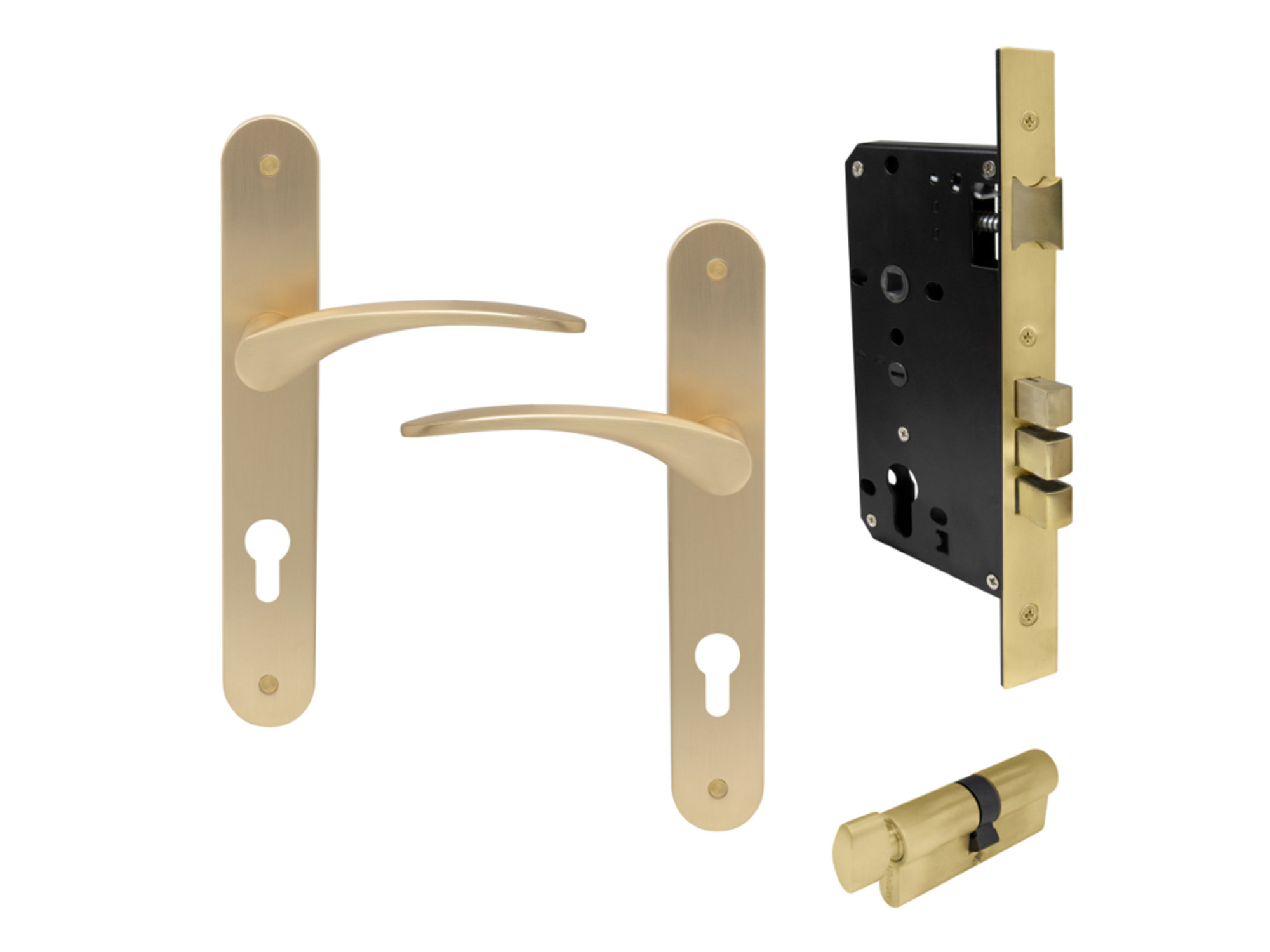 7110 Entrance Set includes handle set with 1143 60mm back set mortice lock, 1148 70mm euro cylinder with turn and 9035 euro escutcheon