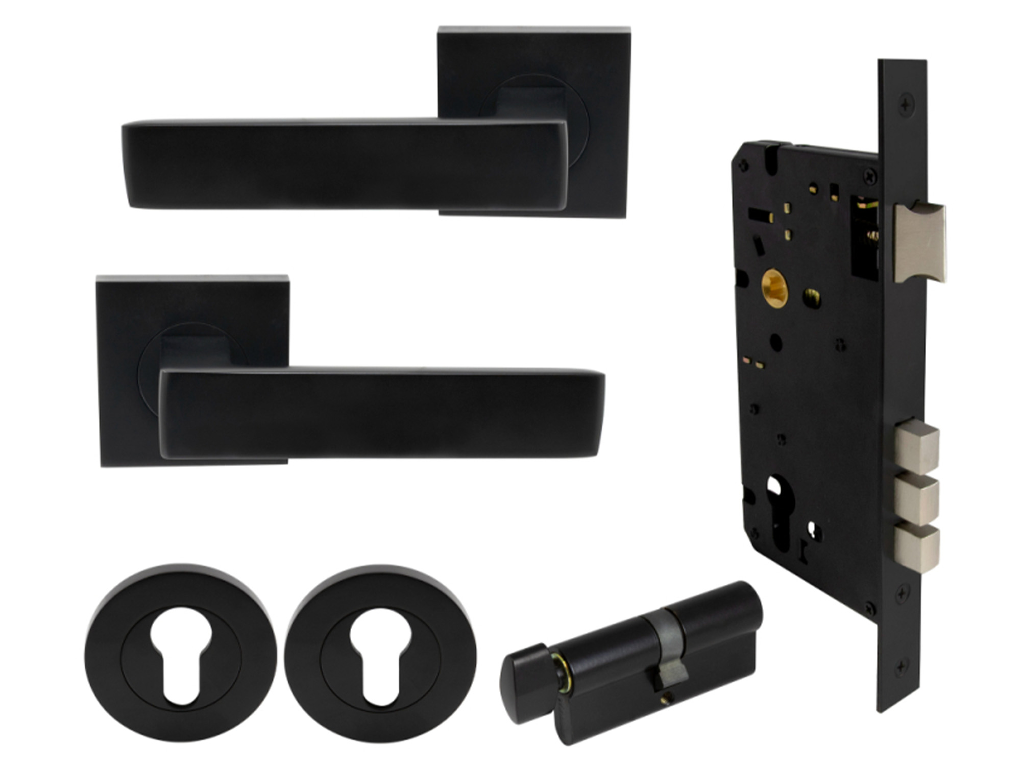 Pricing is for 1 pair of levers, 1 x 1143 60mm backset euro lock body, 1 x 1148 70mm euro cylinder with turn snib, 1 x pair of keyhole escutcheons.