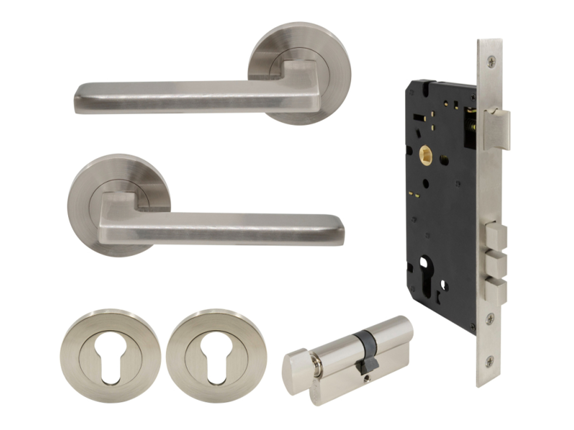 Pricing is for 1 pair of levers, 1 x 1143 60mm backset euro lock body, 1 x 1148 70mm euro cylinder with turn snib, and 1 x pair of 8081 euro escutcheons.