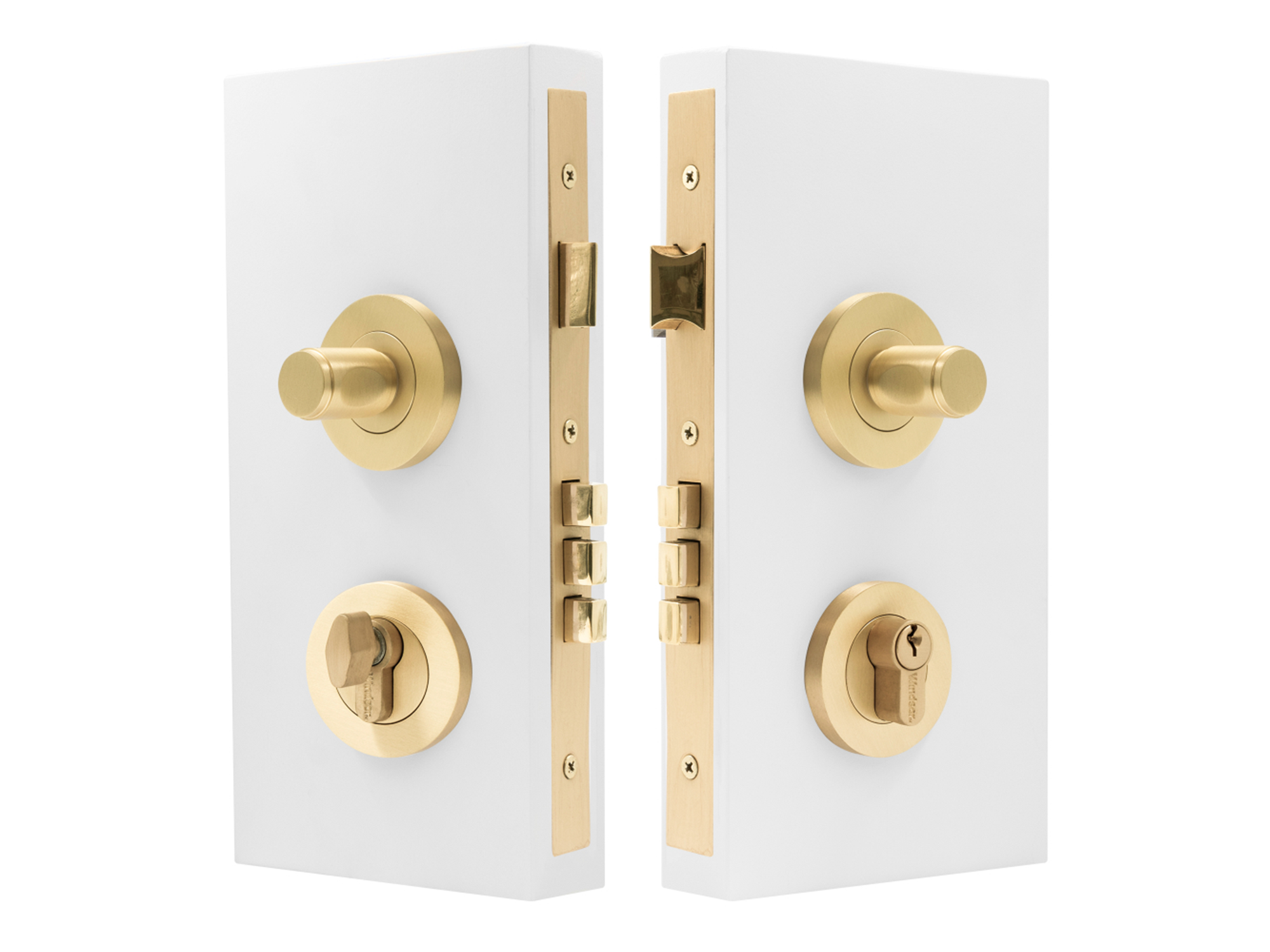 Available in 9 different finishes these 1550 double turn-locks with round escutcheons are designed to be used on entry doors and are a better alternative than using a roller lock which is prone to blowing open.